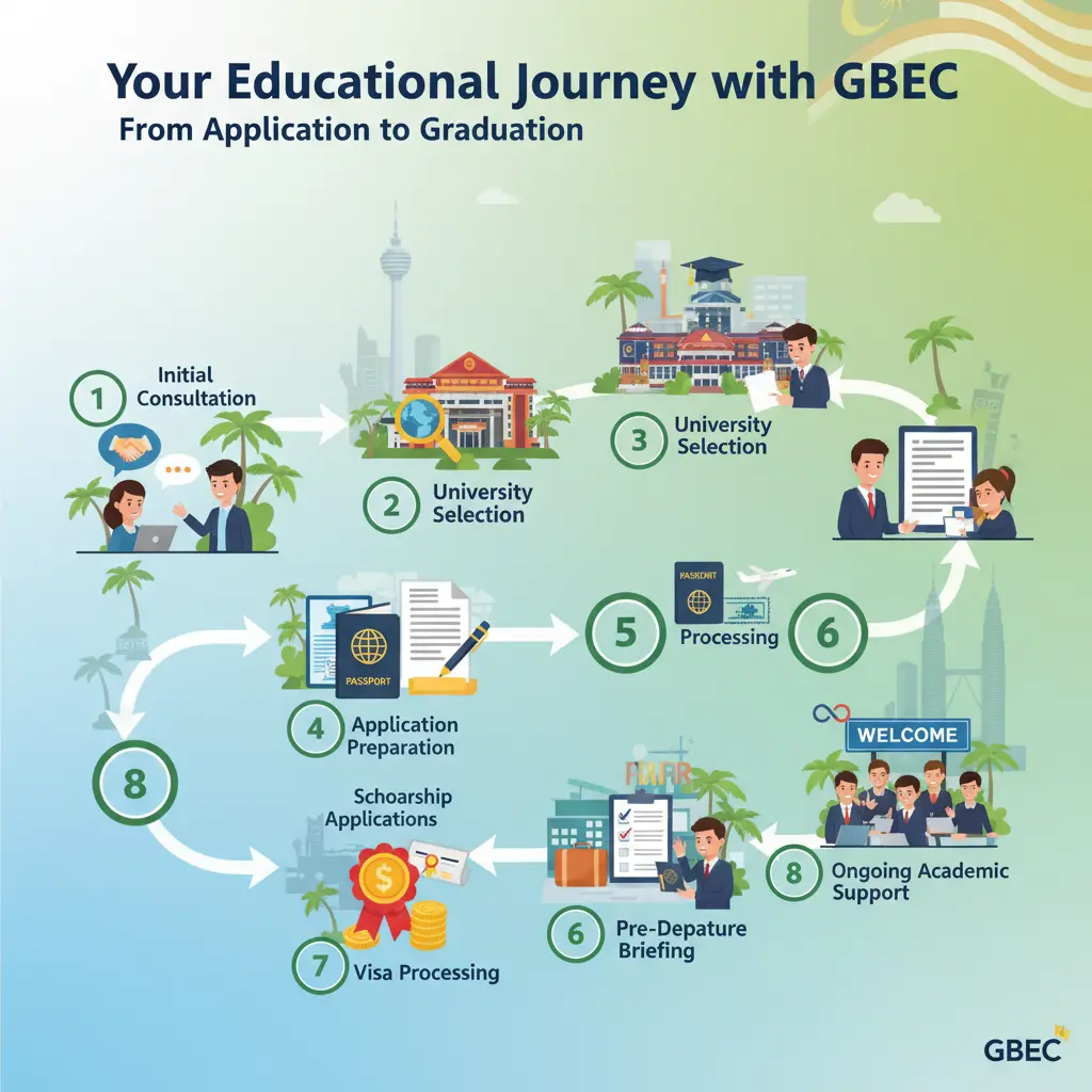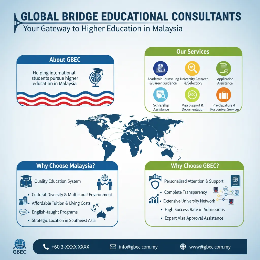 Global Bridge Educational Consultants (GBEC) is a professional education consultancy firm based in Kuala Lumpur, Malaysia. We specialize in guiding international students toward reputable Malaysian universities and colleges.