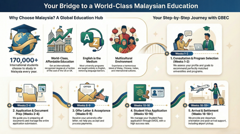 Global Bridge Educational Consultants connects ambitious international students with Malaysia’s top universities through transparent, ethical, and personalized guidance.